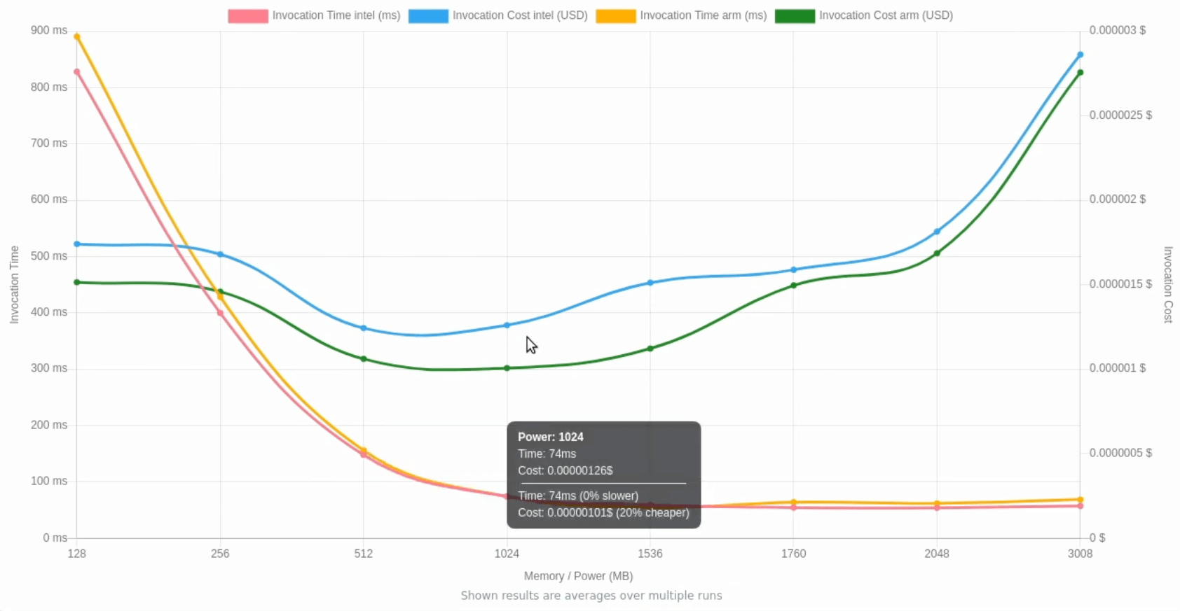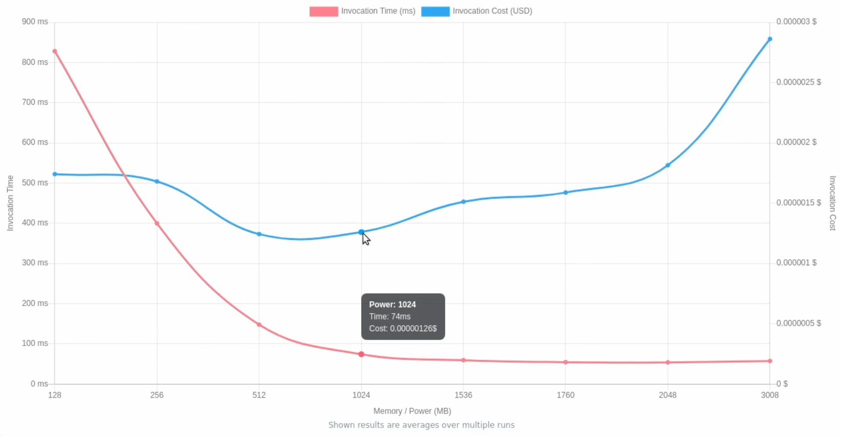 W moim przypadku okazało się, że funkcja z 128 MB wykonywała się przez ~800ms i kosztowała $0.0000021 za wywołanie. Ta sama funkcja z 1024 MB wykonywała się przez ~100ms i kosztowała… $0.0000017! Czyli była szybsza i tańsza jednocześnie!
