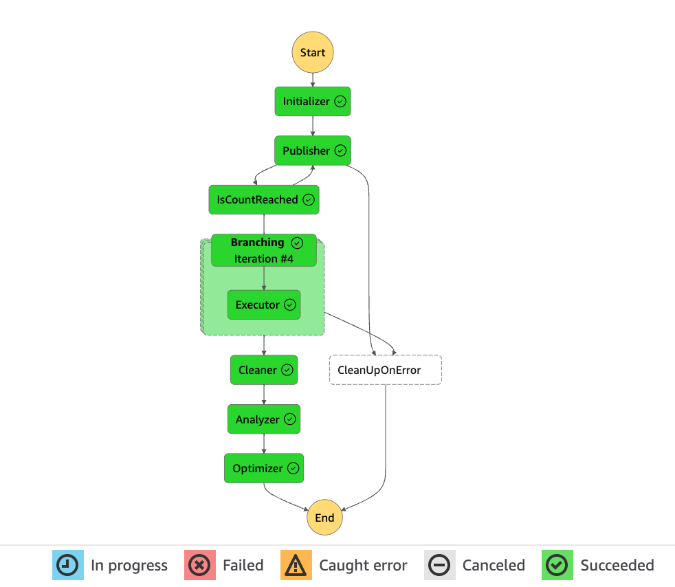 Możesz obserwować postęp w czasie rzeczywistym w graficznym interfejsie Step Functions – widać dokładnie, która konfiguracja jest aktualnie testowana. To naprawdę satysfakcjonujące! 😊